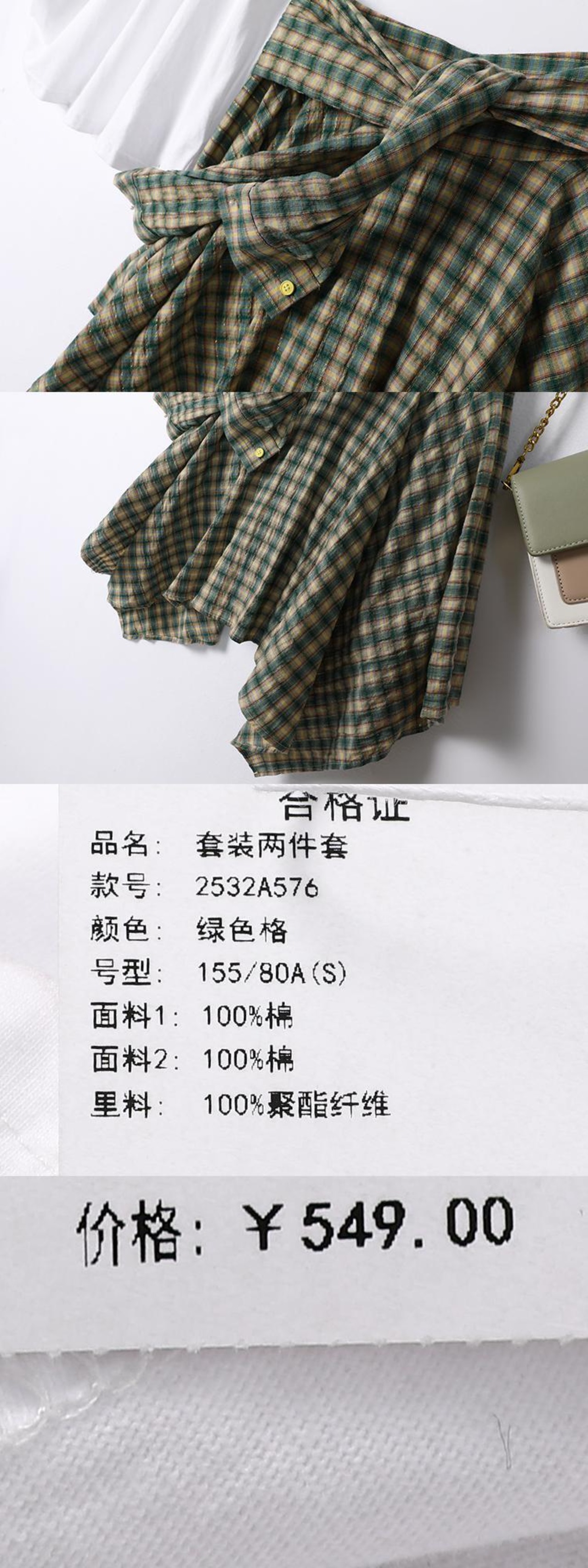 色:緑,グリーンチェックのワンピーススカート,白いワンピース